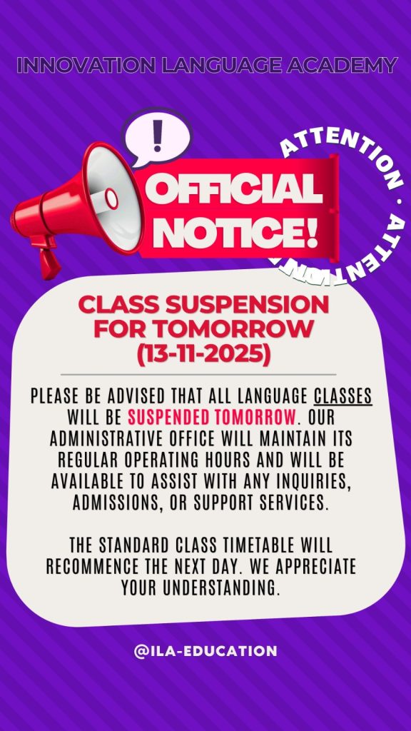 Please be informed that all language classes at Innovation Language Academy will be suspended tomorrow (13th November 2025).