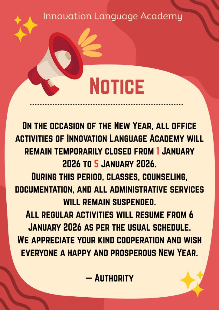 This is to inform all respected students, guardians, and concerned individuals that, on the occasion of the New Year, as part of our institution’s regular holidays and festive celebrations, all office activities will remain completely closed from the 1st to the 5th. During this period, it will not be possible to receive any services by visiting the office in person, including class operations, administrative activities, documentation, or counseling services.